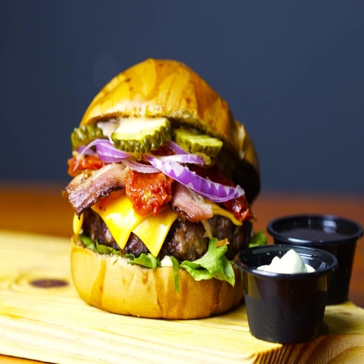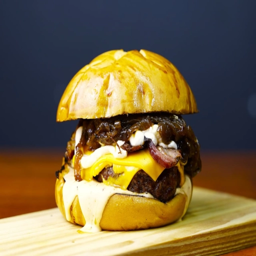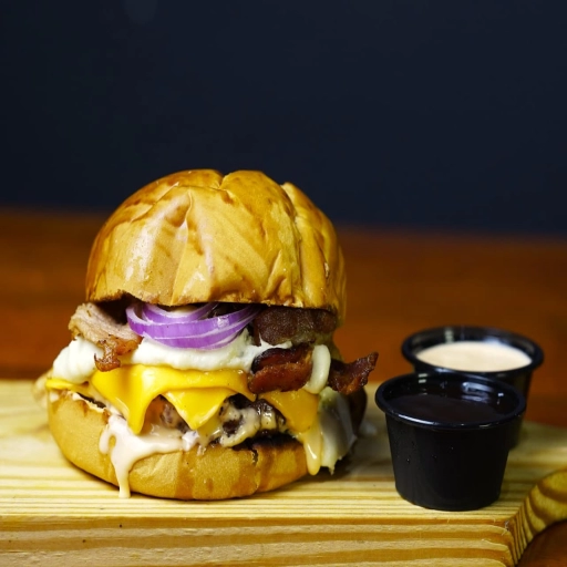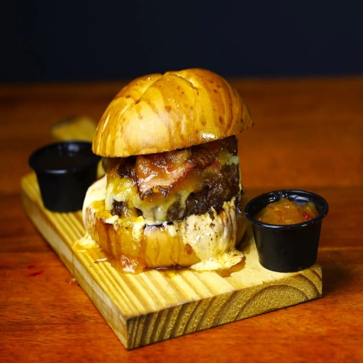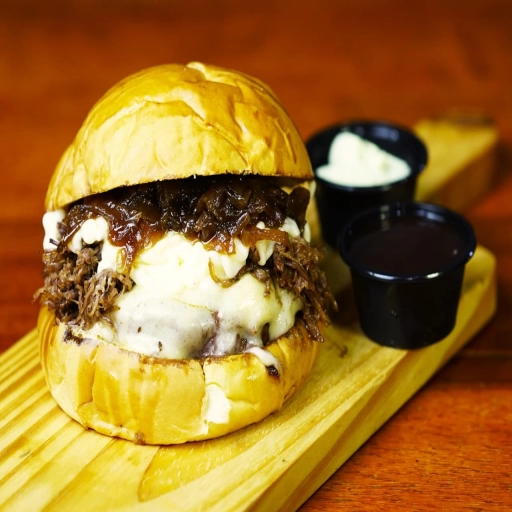 PÃO BRIOCHE ,MAIONESE DE BACON,HAMBURGUER 160G DEFUMADO NA CHURRASQUEIRA DE TONEL ABAFO , QUEIJO MUSSARELA ,COSTELA ... Ver completo