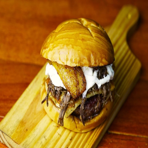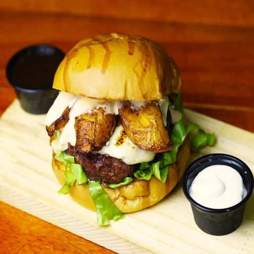 PÃO ARTESANAL,MAIONESE DO CHEFF ,HAMBURGUER 160G ASSADO NA CHURRASQUEIRA DE TONEL ABAFO ,QUEIJO MUSSARELA ,BANANA DA T... Ver completo